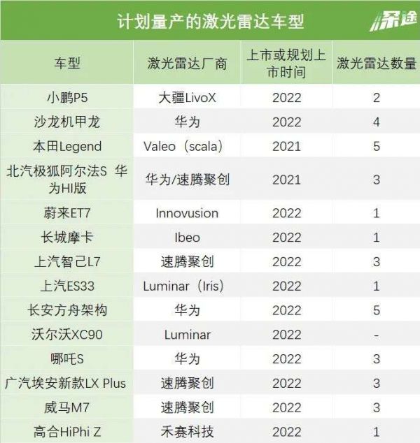 2022年内上市的搭载激光雷达新能源车多达12款。几乎所有已知的电动车品牌都加入了这场军备竞赛。北汽极狐阿尔法S、小鹏P5、蔚来ET7、上汽RS33、智己L7等等新车都预告了激光雷达的上车。