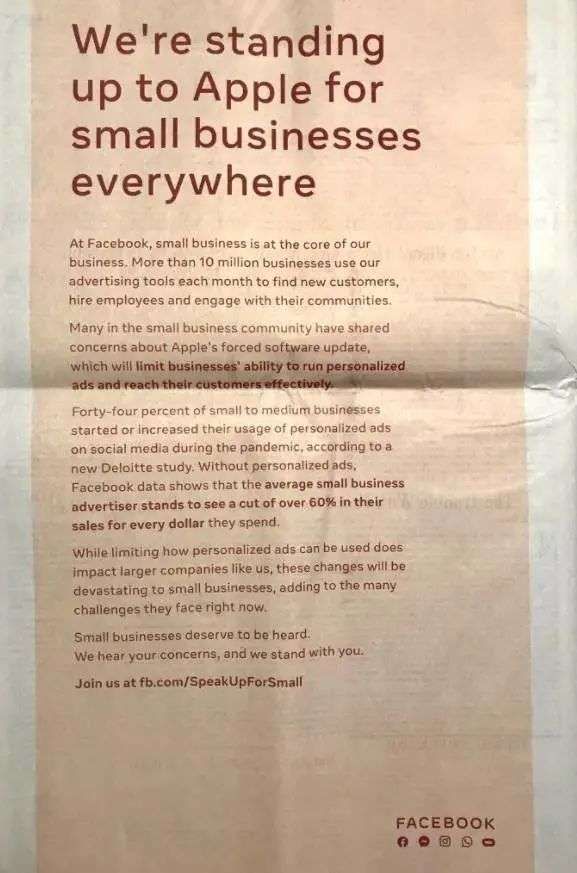 爱范儿曾写过,《金融时报》的一项调查发现,自从今年 4 月苹果开始实行新的隐私设置,Facebook 等四大社交平台损失近百亿美元。2020 年 12 月,Facebook 曾用整版报纸广告批评这项隐私设置,认为它将伤害依赖个性化广告的小型企业。
