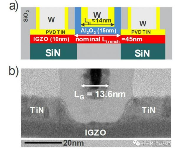 (a) 示意图和 (B) 具有氧隧道和 14nm 栅极长度的后栅极架构中单个 IGZO 晶体管的 TEM 图像