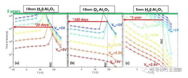 基于不同栅极电介质的 IGZO TFT(具有 12 纳米厚的非晶 IGZO 膜)的失效时间