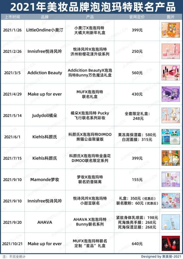 据聚美丽不完全统计,今年来已经有8个品牌与泡泡玛特推出了超10个联名产品,其中包括玫珂菲、科颜氏等国际品牌。