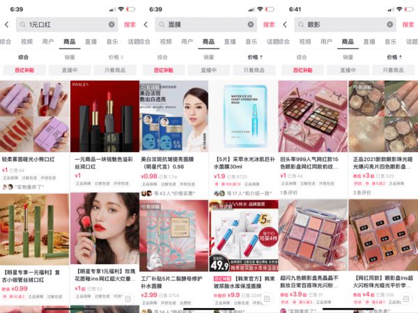 但随着各大新电商平台的出现和入场,低价产品瞄准了这些新的渠道。在这里,消费者可以用9.9元抢到爆款口红、用到不到1元钱一片的面膜。目前,在抖音、快手、拼多多各大平台和直播间的低价商品,涉及面膜、彩妆、护肤、精华、洗护等多种品类。