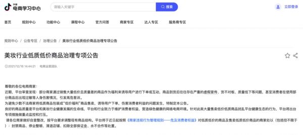 其中明确提到,为避免少数不法商家将低质商品包装成“低价福利”商品售卖,诱导用户下单,伤害消费者利益的问题发生,特制定专项治理公告。