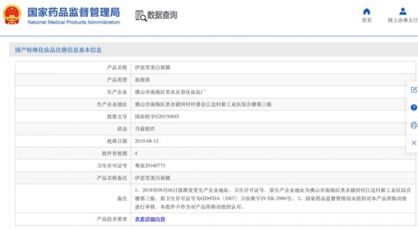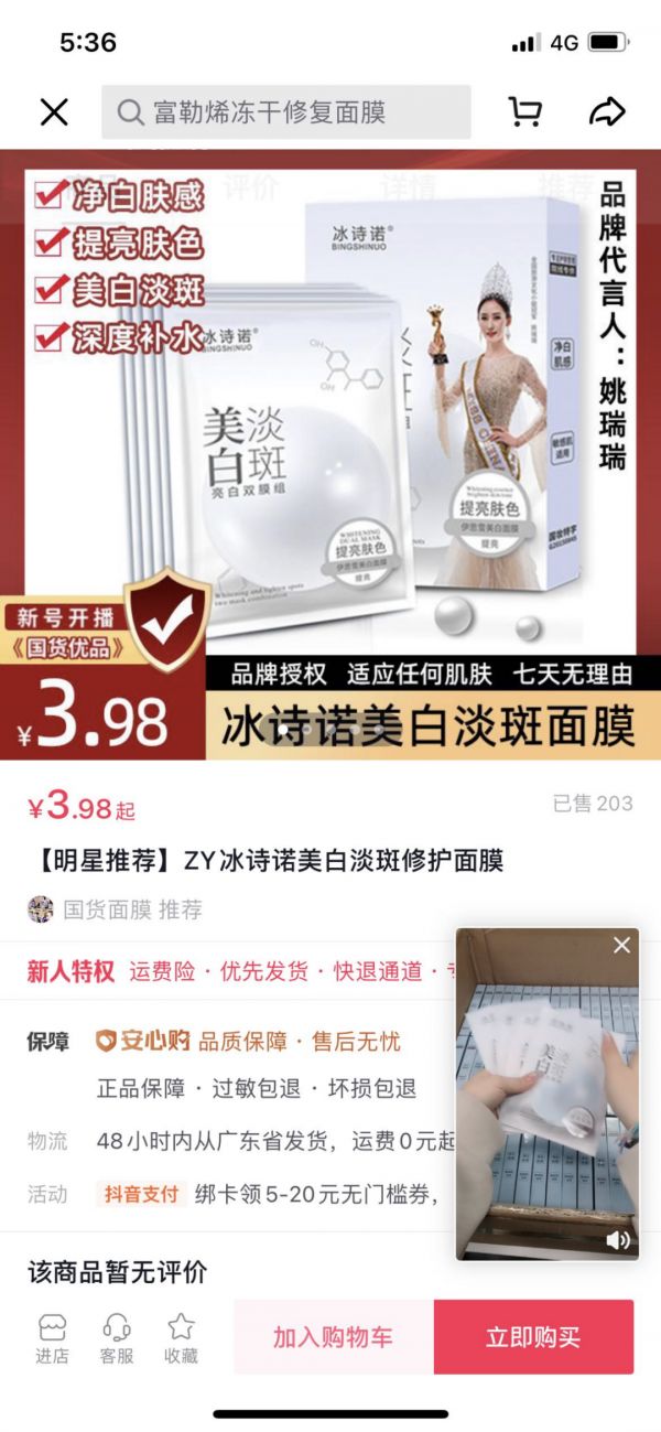 在抖音直播间,不乏这种超低价的明星美妆单品。青眼注意到,在一家名为国货面膜直播间,售卖的一款3.98元一盒(5片)ZY冰诗诺美白淡斑修护面膜,该产品宣称具有美白、淡化色斑等功效并取得了特殊用途化妆品行政许可证,批准文号为国妆特字号G20150845,生产企业为佛山市南海区里水从容化妆品厂。但青眼查询国产特殊化妆品注册信息发现,该批准文号对应的产品名称是伊思雪美白面膜。根据我国特殊用途化妆品“一品一证”的规定,这种行为涉嫌违规。