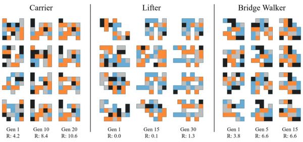 下图每列展示的是四种表现形状最好的一代,不仅如此,算法还优化了这些机器人的“控制器”,基本上就是告诉执行色块做什么和以什么顺序做的大脑。