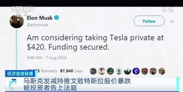 多年来,马斯克在推特上发表过许多有争议的、影响市场的言论。2018年,马斯克曾在推特上表示,将以每股420美元的价格将特斯拉私有化,导致公司股价暴跌。美国证券交易委员会随后对此展开调查。