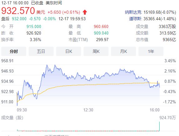 截至当地时间17日收盘,特斯拉股价报收932.57美元,涨0.61%,总市值9365亿美元,比11月5日马斯克发起投票前最后一个交易日收盘1.23万亿美元的总市值减少了近3000亿美元(约合人民币1.9万亿元),相当于恒大的全部负债。