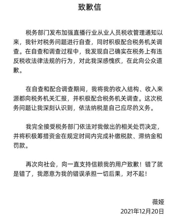 12月20日下午,薇娅通过微博发布致歉信称,在自查和调查过程中,发现自己确实在税务上有违反税收法律法规的行为,对此深感愧疚,在此向公众道歉,并表示,愿意为自己的错误承担一切后果。随后,薇娅丈夫董海锋在其官方微博发布致歉信,信中表示:我深知我们在税务上并不专业,因此聘用所谓的专业机构帮我们进行税务统筹合规,但后续发现这些所谓的合法合规的税务统筹均存在问题。(财经网)