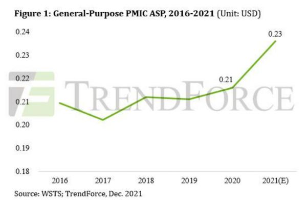 TrendForce的最新调查显示,由于半导体行业供应问题而出现的材料短缺,导致PMIC价格一直呈现上涨的趋势。预计到2022年以前,全球电源管理芯片的平均价格会上涨10%,创下了六年来的新高。