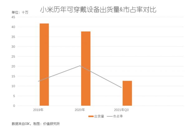 要知道,2020年小米还是全球可穿戴设备市场的销量冠军,全年销量达到3770万台,市占率达到20.3%。2019年虽然远落后于榜首的苹果,依然收获12.4%的市场份额和4170万的全年出货量。如今,这两项数据都较过去两年明显下滑,疲态尽显。