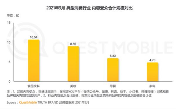 QuestMobile数据显示,2021年9月,典型消费品类内容受众覆盖上,食品饮料、美妆、母婴、家电等领域位居前四,分别达到10.54亿、8.86亿、 5.83亿、 4.7亿;具体到品牌上,喜茶、蜜雪冰城、片仔癀、维维、戴森,内容受众规模分别达到2.4亿、1.5亿、1.38亿、1.07亿、1.05亿。