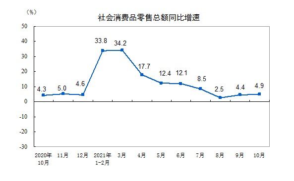 比如,根据国家统计局数据显示, 2021年1-10月,我国社会消费品零售总额358511亿元,同比增长14.9 %。