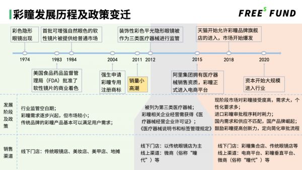在迎来高速发展前,美瞳行业已有近40年的历史了。20世纪70年代 ,彩色隐形眼镜初次问世被用于美化术后的眼部形态。直到2011年,其才作为消费品在中国市场上掀起一个销量小高潮,并在接下来10年起飞。