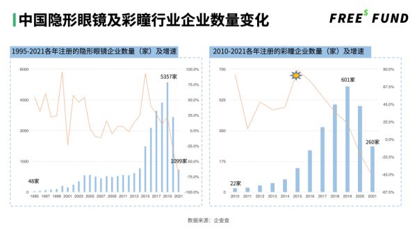 2015年,阿里集团获得医疗器械销售资质,美瞳正式进入电商平台,同年,美瞳注册企业增速达到80%,近几年也就是2019 - 2020年,行业增速虽然有所减缓,整体数量却依旧在上升。