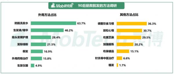 除医疗手段外,“人间蒲公英”们拯救发际线的主要手段还包括防脱洗发水、生发液、假发、食疗等等。
