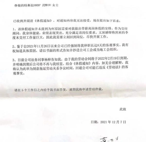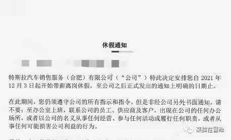 12月4日,蒋某美收到书面《休假通知》,由她的直线领导陆某盖章邮寄。《休假通知》显示,特斯拉决定安排蒋某美自12月3日期开始带薪离岗休假,至公司之后正式发出的通知上明确的日期止。同时,特斯拉还在《休假通知》上要求,蒋某美在休假期间不能到办公室上班,不能联系公司员工、供应商和客户,也不能出现在公司的任何办公场所等。