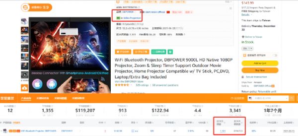其中一款投影仪产品,做到了亚马逊“video projector(视频投影仪)”类目BSR畅销榜的第8名,近30天卖出1101件。