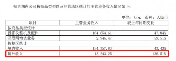 2021年上半年,极米的境外收入超过1.3亿元,大约一半(6500万)来自以亚马逊为主的电商平台,还有一半来自线下销售。