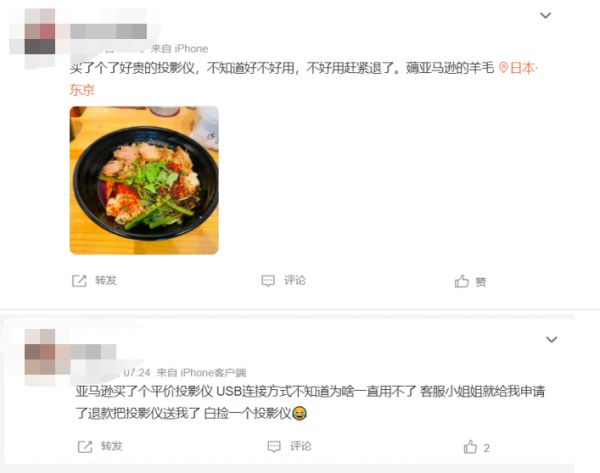 在亚马逊宽松的退货政策下,选择“退款不退货”的买家也有不少,直接白得一个投影仪。