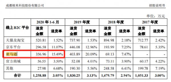 极米科技招股说明书也显示,在国内国外多个电商平台中,亚马逊的退货率是最高的,达到了15.49%(2020年1-6月数据)。
