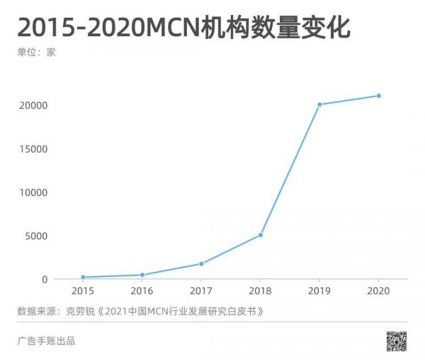 根据《创意进化论》特刊披露的数据,作为创意内容生产的中坚力量,MCN机构的数量从2015年的160家增长到去年的21000家。