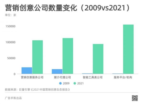 除此之外,营销创意服务公司自2009年至今增长4倍,媒介代理公司增长9倍,智能工具类公司的增幅更是高达90倍。