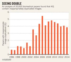 2016年,Nature上就有一篇文章对约2万篇生物医学论文进行人工分析后发现,其中4%的论文都可能包含上述问题。
