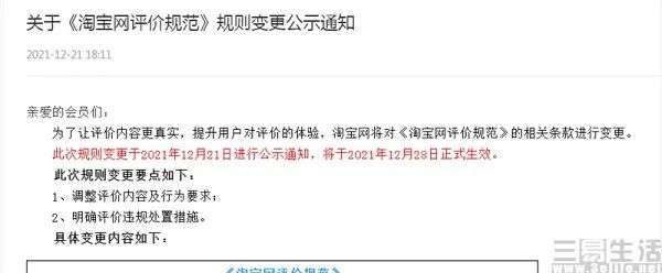 此前被好评返现困扰了许久的消费者,也终于要“解脱”了。继市场监管总局发布《禁止网络不正当竞争行为规定(公开征求意见稿)》后,日前淘宝网发布通知称,将对《淘宝网评价规范》的相关条款进行变更,并将于2021年12月28日正式生效。