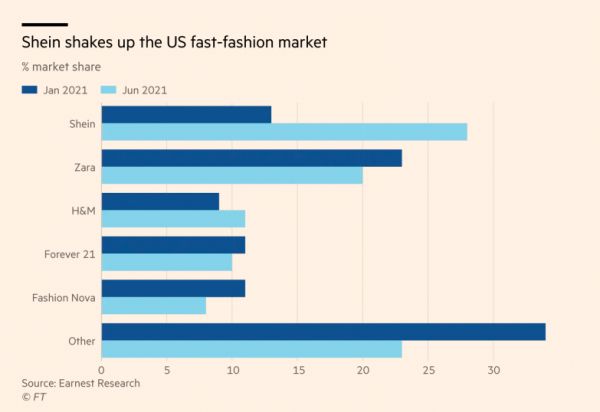 进入2021年,Shein的增速不减,在第一季度便实现36亿美元的营收。一份市场调查显示,2021年6月份,Shein在美国市场快时尚领域内超过H&M占有最大的市场份额。除此之外,Shein还于2021年一度超越亚马逊,成为美国iOS和安卓平台下载量最多的购物应用。