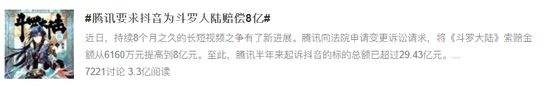 #腾讯要求抖音为斗罗大陆赔偿8亿#