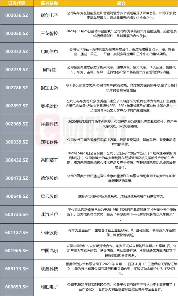 财联社梳理华为汽车产业链概念股一览