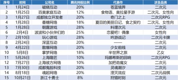 国内市场方面,年内腾讯对二次元、女性向厂商给予了较高的关注。据统计,在60家国内被投厂商中,有15家厂商的品类涉及二次元/女性向,占比达26%。