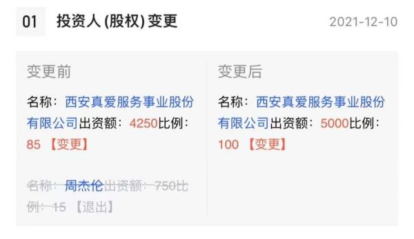 根据启信宝显示,西安真爱范特西餐饮娱乐有限公司日前发生工商变更,周杰伦退出股东行列,同时李家烈、曾贤毓等退出主要人员行列。12月21日,粉巷财经(ID:nbdfxcj)致电该公司,截至发稿前未收到具体回复。