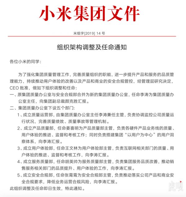 小米集团宣布了新的组织架构调整和任命通知,小米将原集团质量办公室与安全合规部合并为新的集团质量办公室,任命李涛为办公室主任,向副总裁颜克胜汇报。新成立的集团质量办公室下设质量运营部、产品质量部、用户体验部、服务质量部、安全合规部等五个部门。