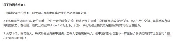 谈到特斯拉国产化对国内市场的影响,蔚来表示,特斯拉国产的落地,对于国内智能电动车行业的市场培育是好事。