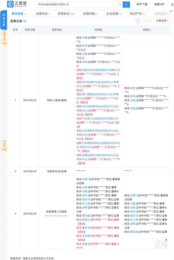 据天眼查数据显示,5月29日,杭州如涵控股股份有限公司发生多项变更,阿里巴巴、君联资本、赛富投资、昆仑万维、远镜创投、启明创投、钟鼎资本均退出该公司股东行列,同时4名董事退出。变更后该公司最大股东为创始人冯敏。