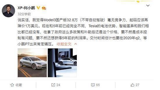 2. 小鹏汽车董事长何小鹏在微博上对于国产特斯拉的价格发表评论称,“我觉得Model3国产版32.8万(不带自动驾驶)毫无竞争力,起码应该再降价1万美元。”何小鹏表示,特斯拉的电池优势、智能差异和我们相比都已经没有,在拿了政府这么多政策和补助后还是这个价格,要不然是成本控制有问题,要不然还想获得5年前的利润率。