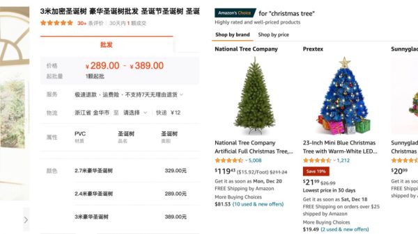 一棵3米高、价值300元人民币的人造圣诞树,从1688出发,到亚马逊、到沃尔玛,价格直接翻番。一个圣诞主题的头箍,在1688上批发价2.5元人民币,在亚马逊上卖2.5美元。多年以来,义乌作为圣诞商品的源头,供应链上的商人也赚得盆满钵满。比如义乌圣诞工艺品行业的头部企业鑫特安,据其官网介绍,年销售额达1.2亿元。