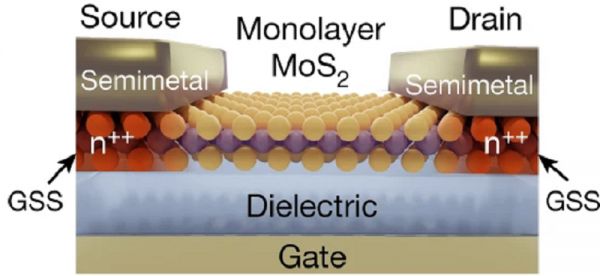 今年5月份,台积电、台湾大学和麻省理工学院联合在Nature上发表了用半金属铋作为接触电极的研究,在单层MOS2上实现了123微欧姆米的接触电阻率和1135μA/μm的电流密度,实现了在电阻率和电流密度上的突破。这使二维半导体尺寸有望接近量子极限,成为1nm制程的关键技术突破。