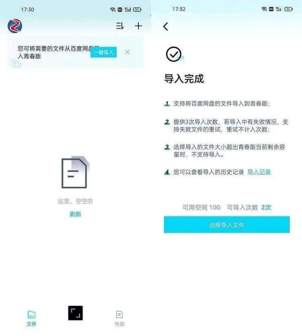 首先,青春版与原版并不互通。如果用户想要把原本账号中的文件转移到青春版中,百度也是允许的,但是只有3次。不是每日,也不是每月,而是“永久”。也就是说,每个账号只有转移3次文件的权力,而后就各走各路。