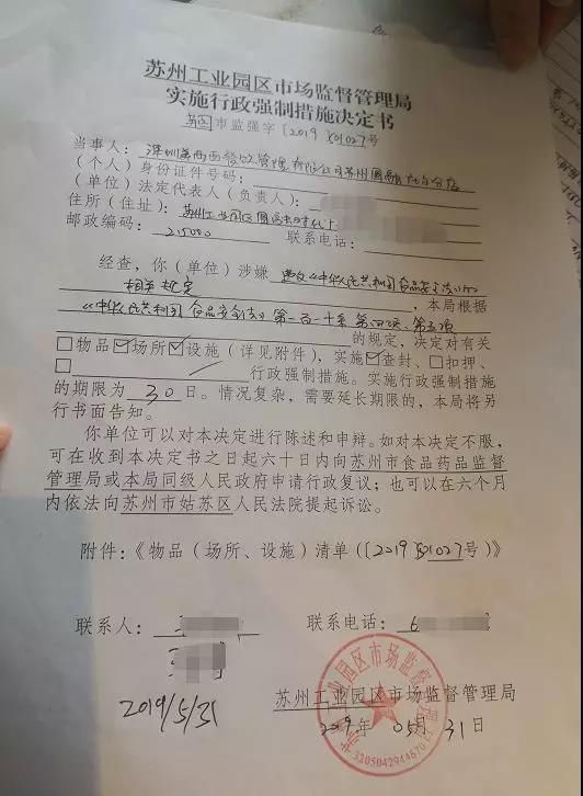 《每日经济新闻》记者注意到,根据该决定书,苏州工业园区市场监督管理局根据《中华人民共和国食品安全法》(简称《食品安全法》)第一百一十条,第四项、第五项的规定,“决定对有关场所、设施”,实施“查封行政强制措施”,实施期限为30日。