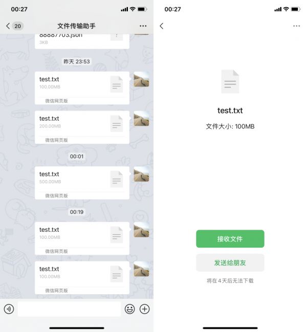 与客户端相同,网页版「微信传输助手」支持传输最大 1GB 的文件。但如果所传输的是一个大文件,需要在客户端进行点击「接收文件」才会开始下载。这一点需要特别注意,避免发生文件传输了,但是在需要用的时候发现还没下载,甚至已经过期的尴尬情况。