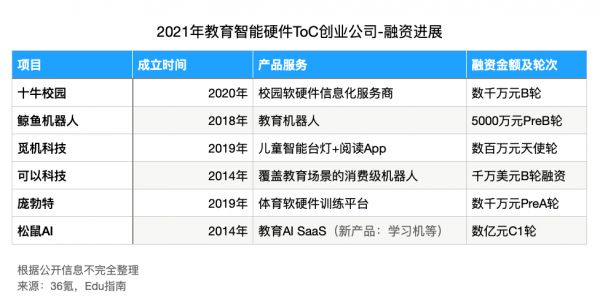 比如完成数千万元B轮融资的十牛校园,主营业务是面向校园的软硬件信息化服务。获投数千万元PreA轮融资的庞勃特,主营业务是面向学校与机构的运动训练软硬件工具。完成数亿元C1轮的松鼠AI公司,更是以ToB的教育自适应SaaS服务起家,2021年才宣布推出面向C端学生的教育智能硬件产品:学习机。