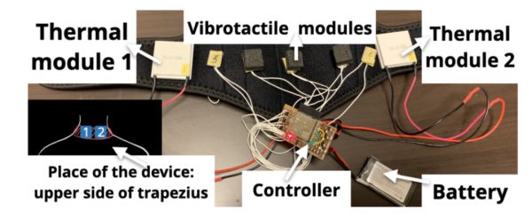 热触觉颈带包括2个Peltier热电模块和最多6个固定在颈带上的触觉振动执行器,主要通过驱动物理感觉来驱动情感的互感技术。
