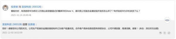 近期有投资者在投资者互动平台向提问国内铰链供应商宜安科技提问,问题指出,除了给华为供货外,宜安科技还有哪些客户。宜安科技对此回应,公司液态金属铰链已有5家客户合作。