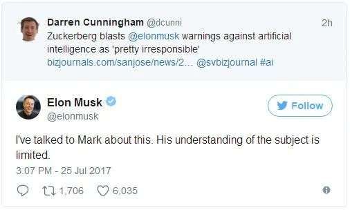 马斯克显然不高兴,发推称:“我和扎克聊过人工智能,他对这个领域的了解很有限。”意思就是,说得好下次别说了,你懂什么啊你?