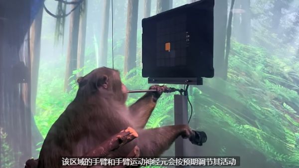 在视频中,9岁的猕猴盯着电脑屏幕打乒乓球游戏,它在此视频拍摄前6周刚刚植入了Neuralink。
