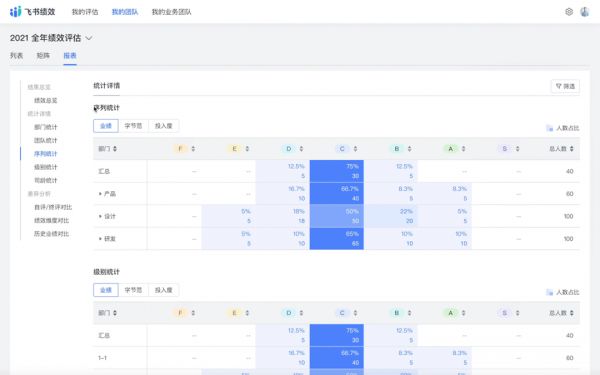 借助绩效工具中的报表和矩阵,管理者可以综合全方位数据进行校准、查看公司的整体绩效分布情况。如果将自己团队的绩效情况放在一个更大的背景板中,管理者便能判断团队的绩效分布是否合理。