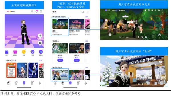 以虚拟形象APP起家的Zepeto为例。Zepeto诞生于2018年,为韩国头部互联网企业Naver推出的虚拟形象APP,用户可根据个人喜好打造虚拟形象并购买虚拟服饰进行装扮。在完成虚拟形象DIY以后,用户可选择背景、姿势进行“拍照”,Zepeto提供的“合影”与分享功能使其在熟人社交圈中快速扩散。