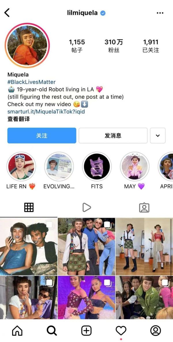 但对于品牌来说,“养成”一个虚拟偶像并非容易,依靠的是持续不断的文化输出和个性一致。国外虚拟偶像Lil Miquela在社交网站上十分出众,会分享自己的穿搭、美食、社交,表情动作多变,像年轻人一样。